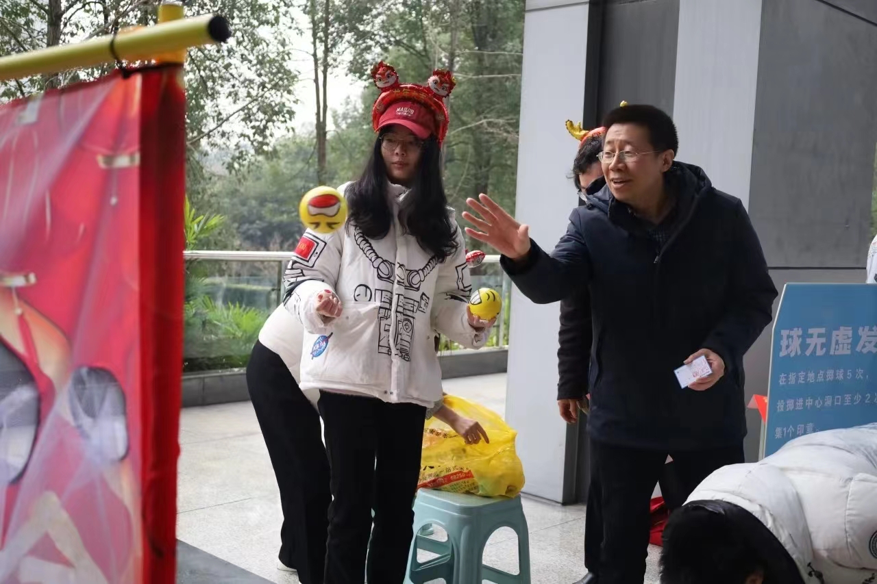 老师们在丰富多样的趣味运动中纷纷一展身手。“恰到好处”活动中,老师们精准判断、巧掷乒乓球;“龙行虎步”活动中,老师们身姿灵活、手脚并用,在身体不触地的情况下从起点行进至终点;“尽情摇摆”活动中,老师们通过身体律动将绑在腰间盒子里的乒乓球摇落;“球无虚发”活动中,老师们身手敏捷、向着“金龙贺岁”的龙眼精准投球。精心设计的趣味运动项目让参与者尽情享受运动竞技的快乐,围观者或欢呼雀跃或加油鼓劲,众人其乐融融共庆新年。