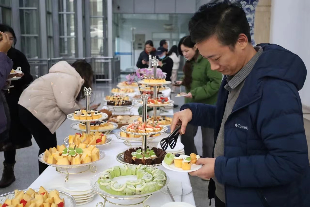 还准备了多样丰盛的糕点、水果和茶水。师生们在游玩活动项目玩之余可以停一停、歇一歇,补充能量,在片刻休息中享受美味,感受新年愉快氛围。