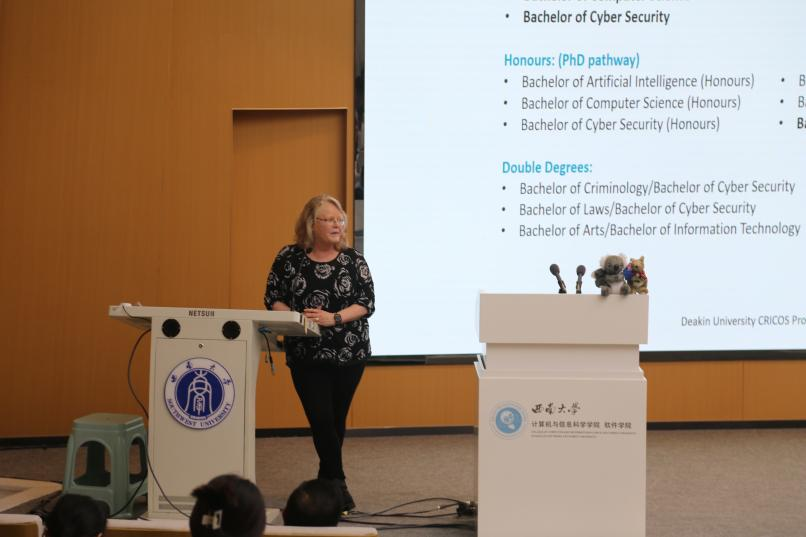 院长Trina Myers教授首先向同学们介绍了迪肯大学的生活环境、办学资源与优势、专业方向选择以及科研项目概况,表示非常欢迎同学们加入两校的合作办学项目。随后,迪肯大学信息技术草榴社区