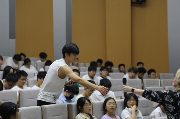 交流会特别设置了互动环节,线上扫码回答问题与线下提问交流相结合。同学们就赴外学习的成绩与语言要求、就业前景、奖学金政策、医疗保障等方面与Trina Myers院长、刘晓教授等进行了积极交流。