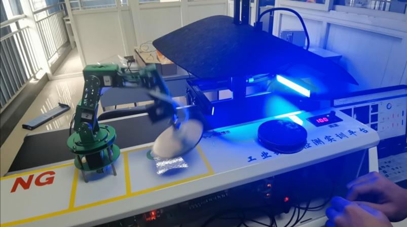 作品赛道为工业缺陷检测,使用了重庆海云捷讯提供的硬件实验平台,使用树莓派4b作为主控,英特尔的Cyclone V SOC开发板用于运行SSD算法进行推理,最终实现了对不同缺陷类型的铝片的识别、报警和抓取。