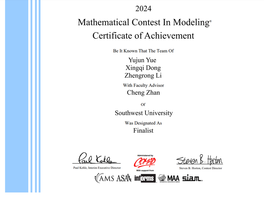本科学生岳榆钧、董星岐、李政融,在詹成老师的指导下,于全球数万支队伍中脱颖而出,斩获特等奖提名(Finalist,简称F奖)的优异成绩,此外还有数十只队伍获一等奖(Meritorious Winner,简称M奖)和二等奖(Honorable Mention,简称H奖)。