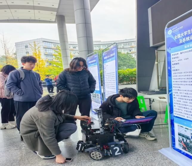 本科生的科研实力和创新能力。现场氛围活跃,吸引了大批师生关注,同学们表现出极高的参与热情,纷纷停留观看并亲身体验。活动还特别邀请了华为鸿蒙智行,为同学们提供M5、M7、M9三款智驾车型的试驾体验,感受科技与生活的完美融合。