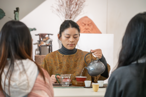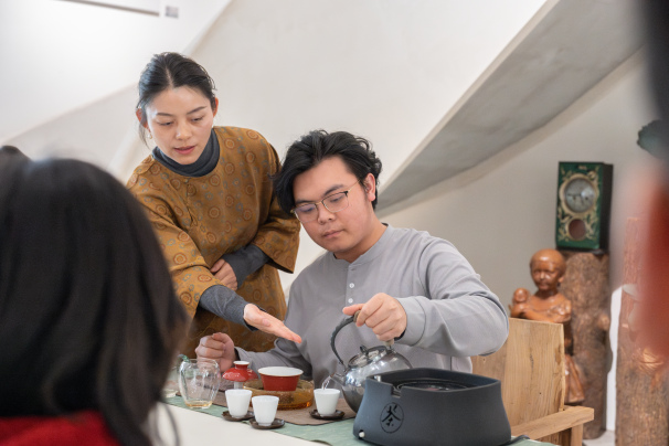 活动的第二部分为品茶鉴茗,伴随着余韵悠长的古琴声,茶艺老师以端庄的仪态、娴熟的技艺向同学们展示完整的茶艺演示,令同学们的心渐渐沉静下来。茶艺老师将茶文化的缘起与发展娓娓道来,“不同天气和心境泡出来的茶不一样,好的茶泡出来是茶汤,余韵浓厚,口感带点绵绸。”茶艺老师通过沏茶、赏茶、闻茶、饮茶等知识讲解,引领同学们逐步感受茶道的艺术魅力。最后在茶艺师指导下初试茶艺,并与老师交流饮茶文化,收获颇丰。