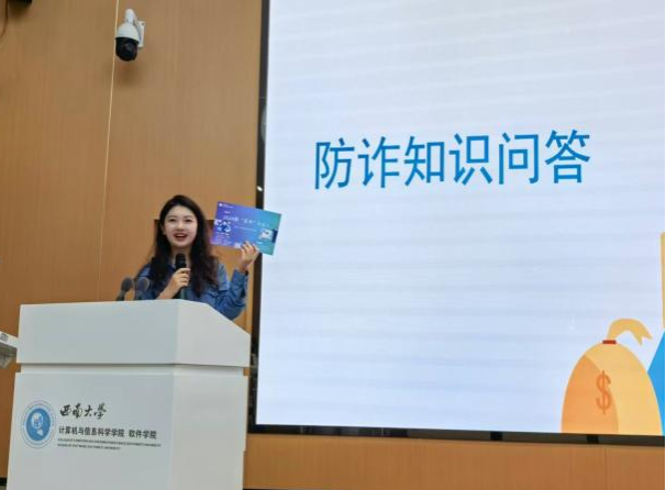 活动设有奖防诈知识问答环节,由2024级辅导员马潇潇老师负责主持,同学们以“开盲盒”的形式先抢占答题席位后读题作答。题目内容丰富多样,涵盖了从简单的国家反诈中心电话号码,到帮信罪、虚假征信诈骗等各个领域的知识,同学们纷纷表示新奇有趣,在轻松愉快的氛围中吸收和巩固了反诈知识,现场气氛热烈而紧张。