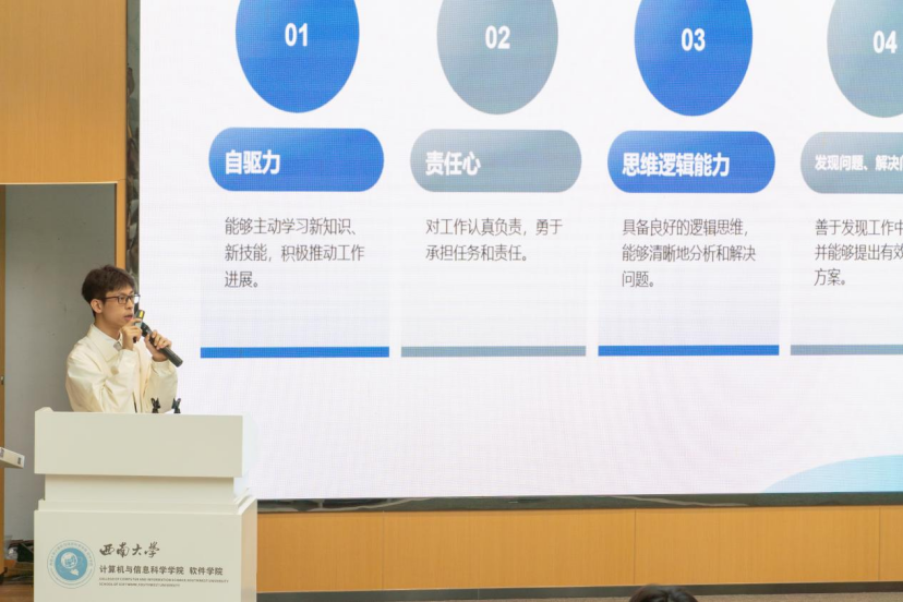 最后,2022级软件工程(普通)专业现入职腾讯的吕皂松同学以《从校园到腾讯:一名ITer的技术跃迁之路》为题,分享个人成长故事,回顾了大学期间参与竞赛、实训项目的经历,强调“技术深度与广度需同步拓展”,并透露在腾讯面试中,其独立制作的个人网站主页成为关键加分项。吕皂松同学还总结了互联网企业看中的五大品质,包括:自驱力、责任心、逻辑思维能力、发现问题与解决问题能力,建议同学们直面求职困难,勇敢投递简历,现场互动热烈,反响积极。