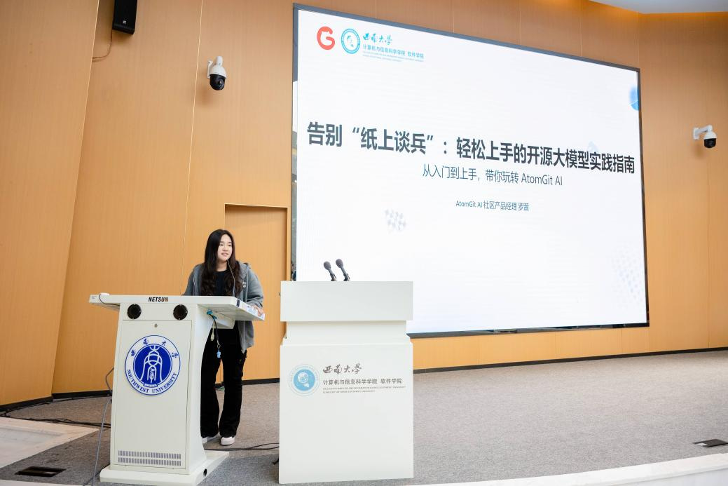 AtomGit AI社区产品经理罗萱带来开场分享《告别“纸上谈兵”:轻松上手的开源大模型实践指南》。她系统介绍了AtomGit AI平台如何通过“查、找、用”模型全链路服务,赋能开发者低门槛、高效率地实现AI应用创新,并鼓励学生积极参与开源项目,积累实战经验。