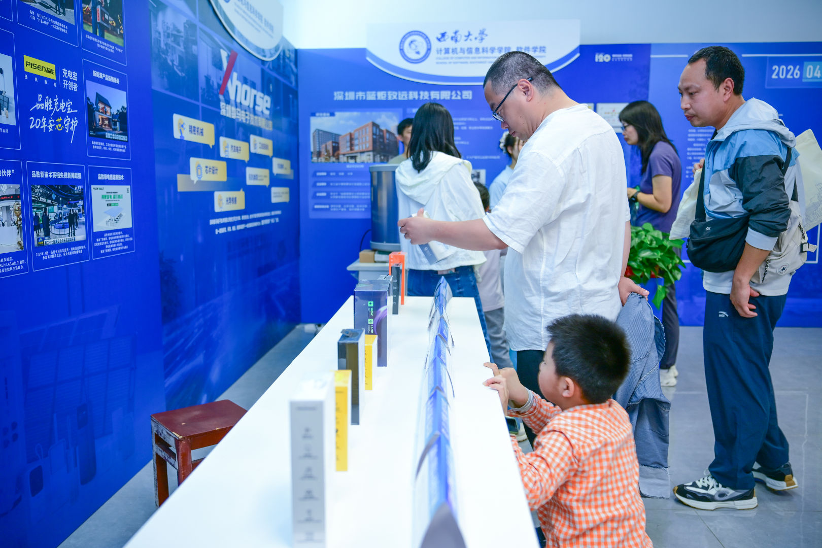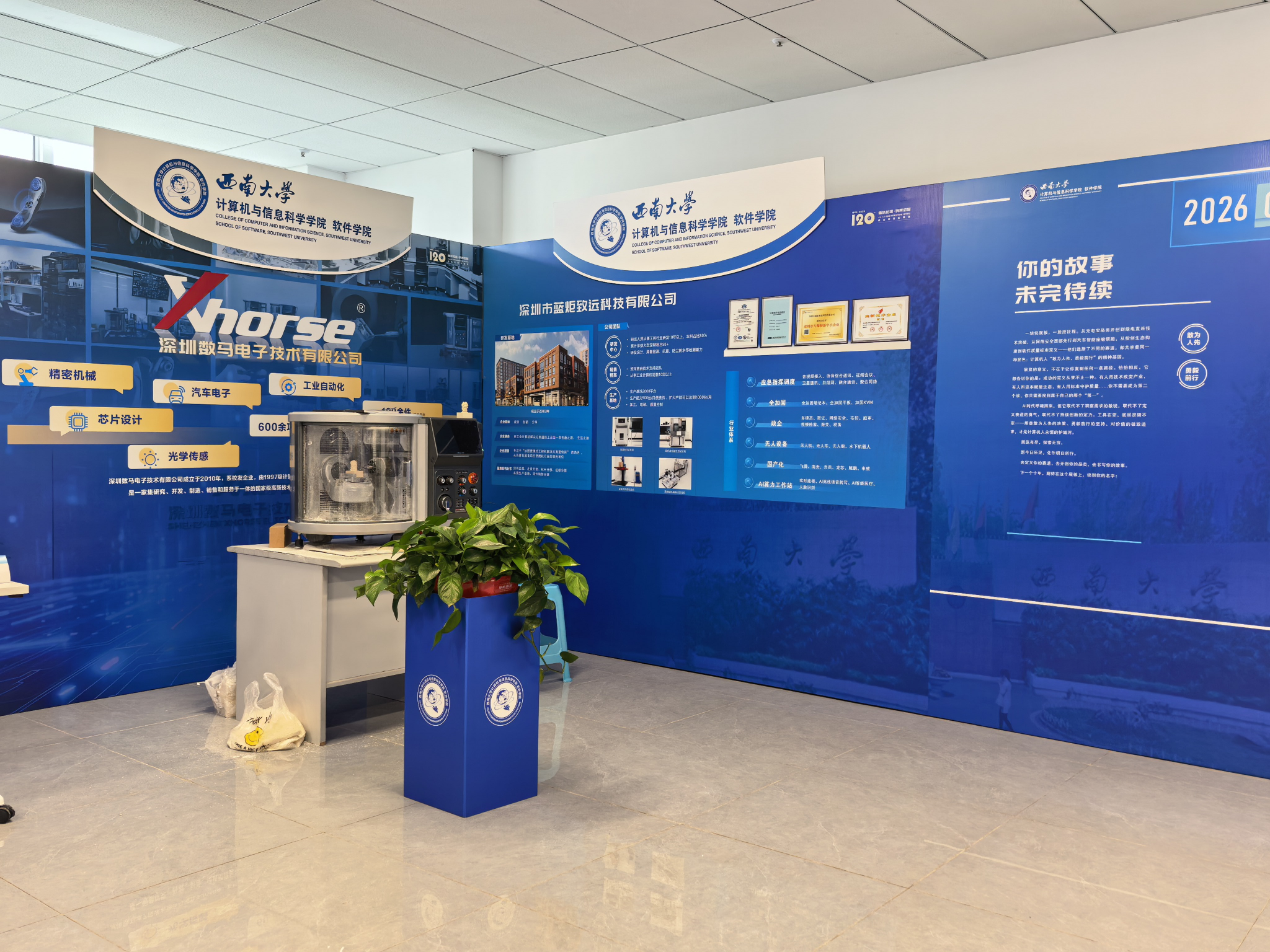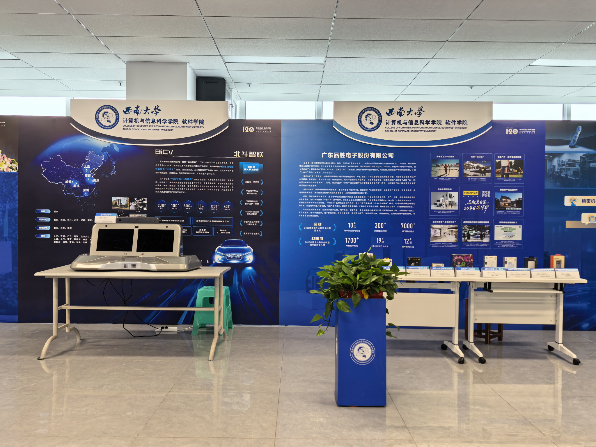 本次展览以“循慧拓途·码青启智”为主题,采用“展板叙事+实物展示”的融合形式,参展校友企业覆盖消费电子、新能源、网络安全、智能汽车等多个领域,充分体现计算机技术的融合力与渗透力,彰显学科对各行业的深度赋能价值。参展企业通过展板梳理发展历程与创新成果,同时带来代表性产品现场展示。品胜电子展出充电产品与智能耳机系列,呈现产品创新升级路径;北斗智联展示高性能舱联融合平台,直观诠释“软件定义汽车”理念;深圳数马电子的桌面级五轴数控机床现场加工,展现计算机技术赋能高端制造的广阔前景。