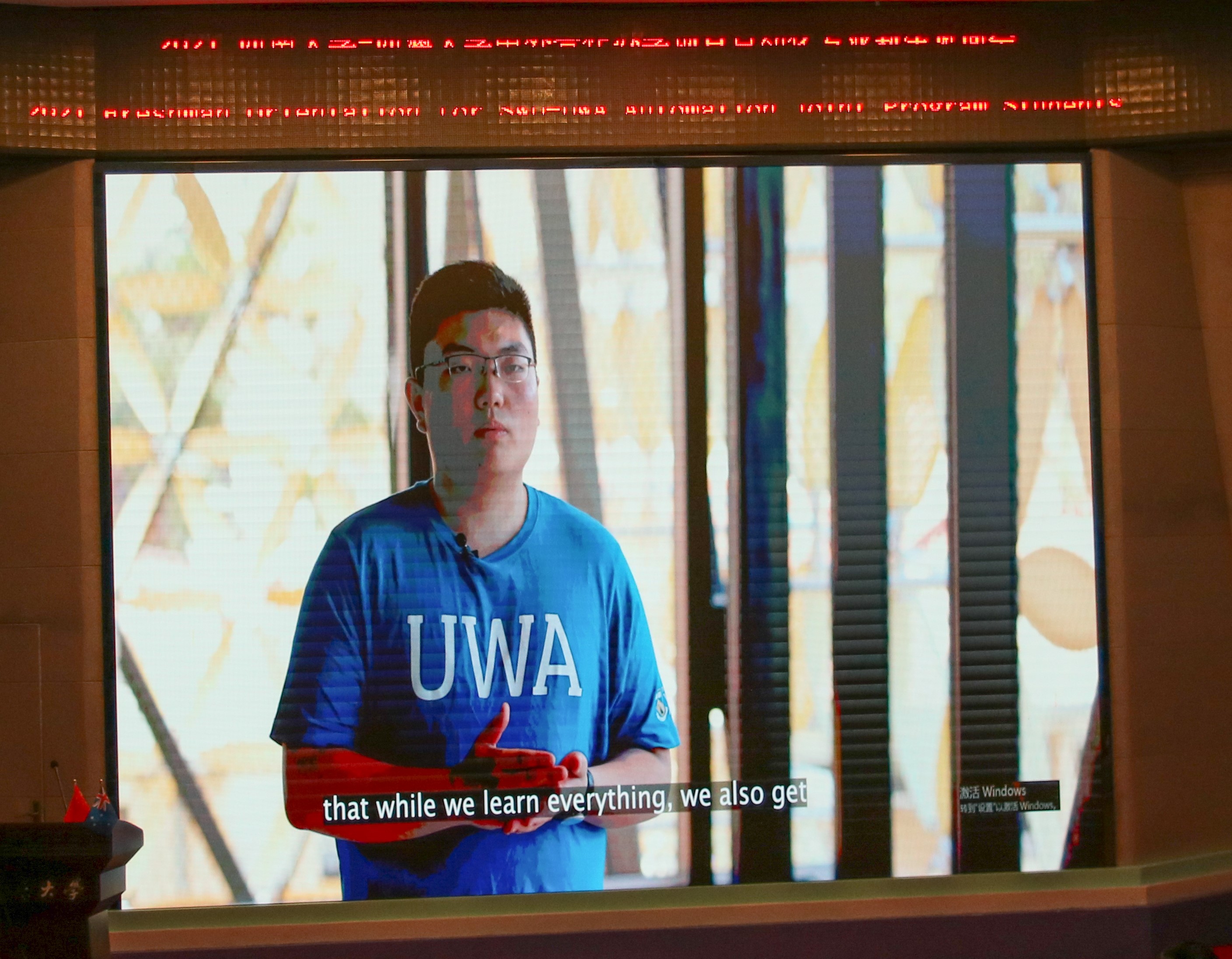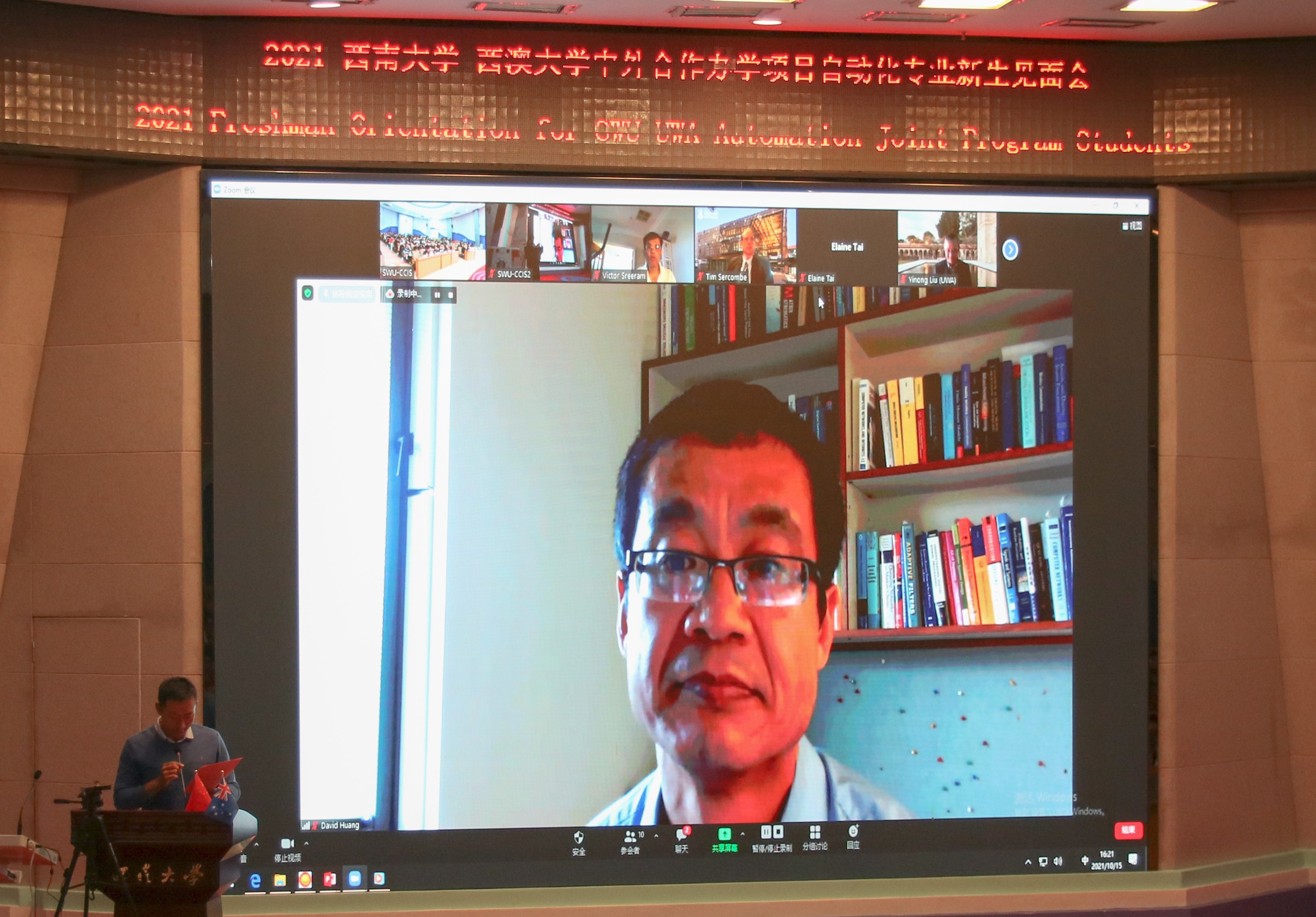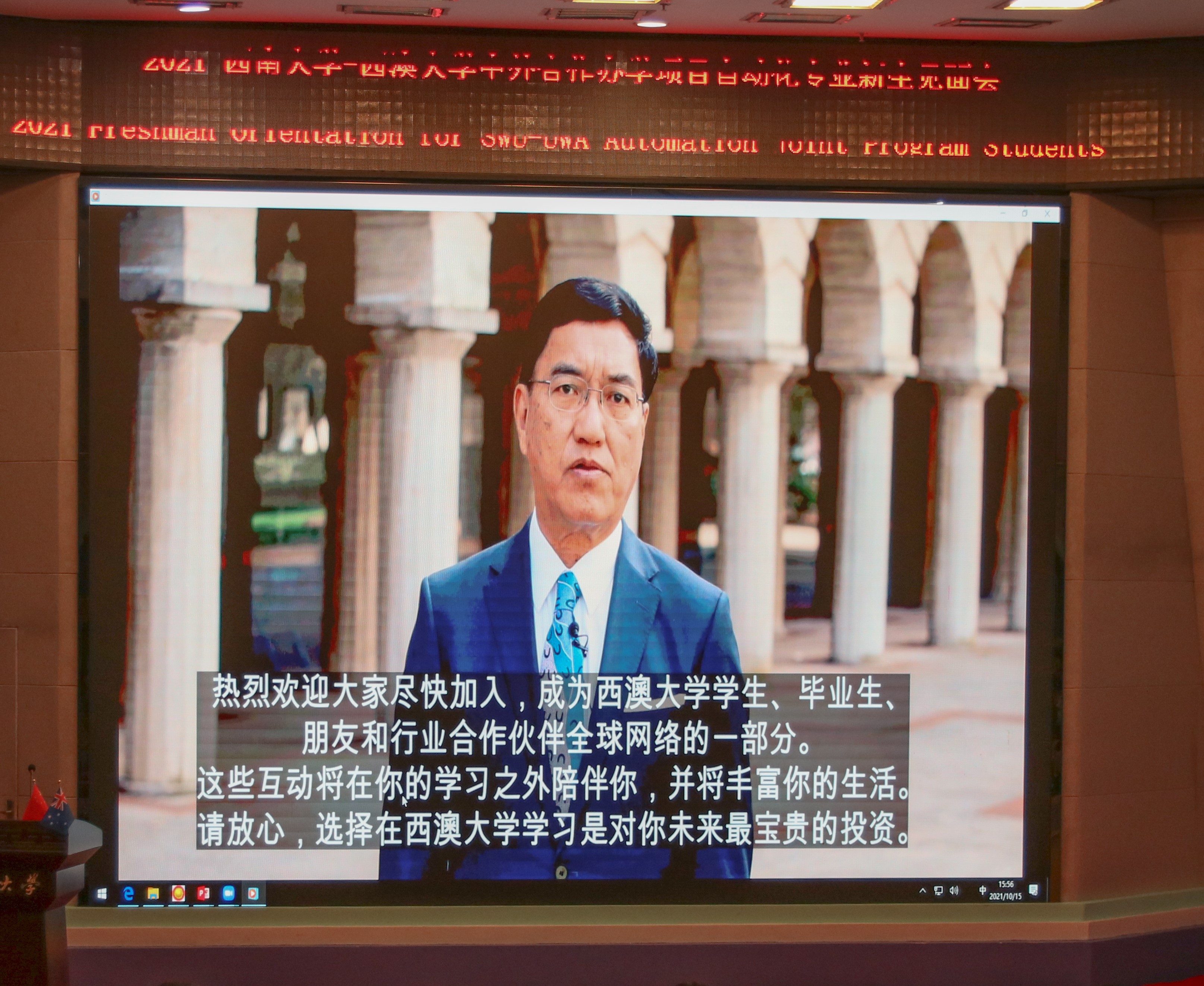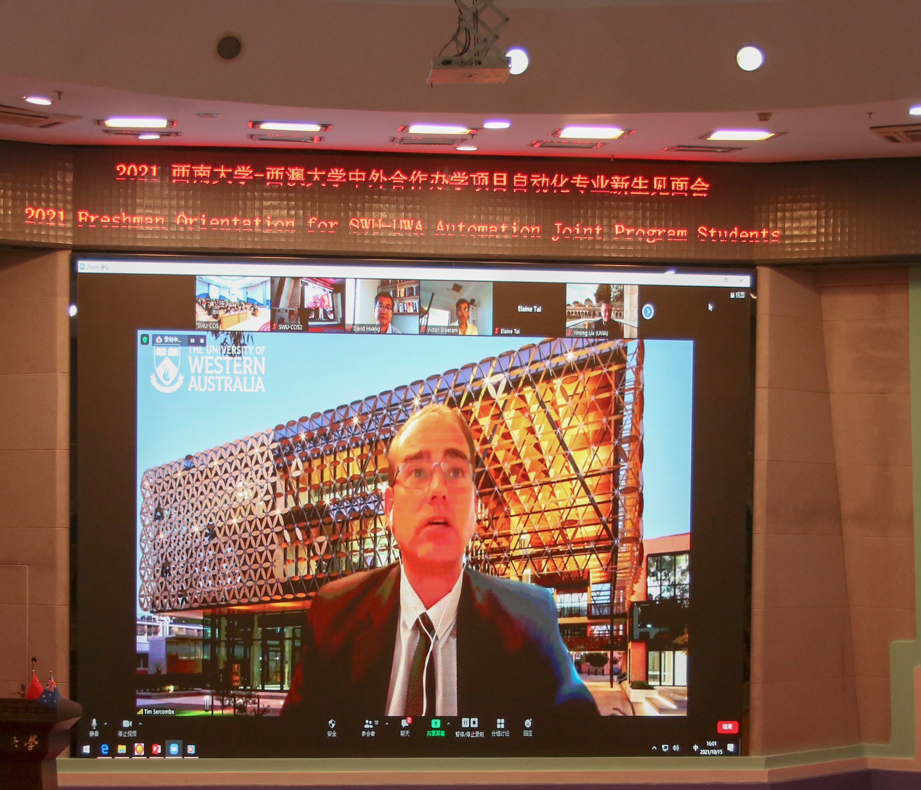 院长蒂姆·塞尔科姆教授在线表达了对2021级新生的祝福,并详细介绍了合作办学以来进入西澳大学深造的西大学子取得的优秀成绩。