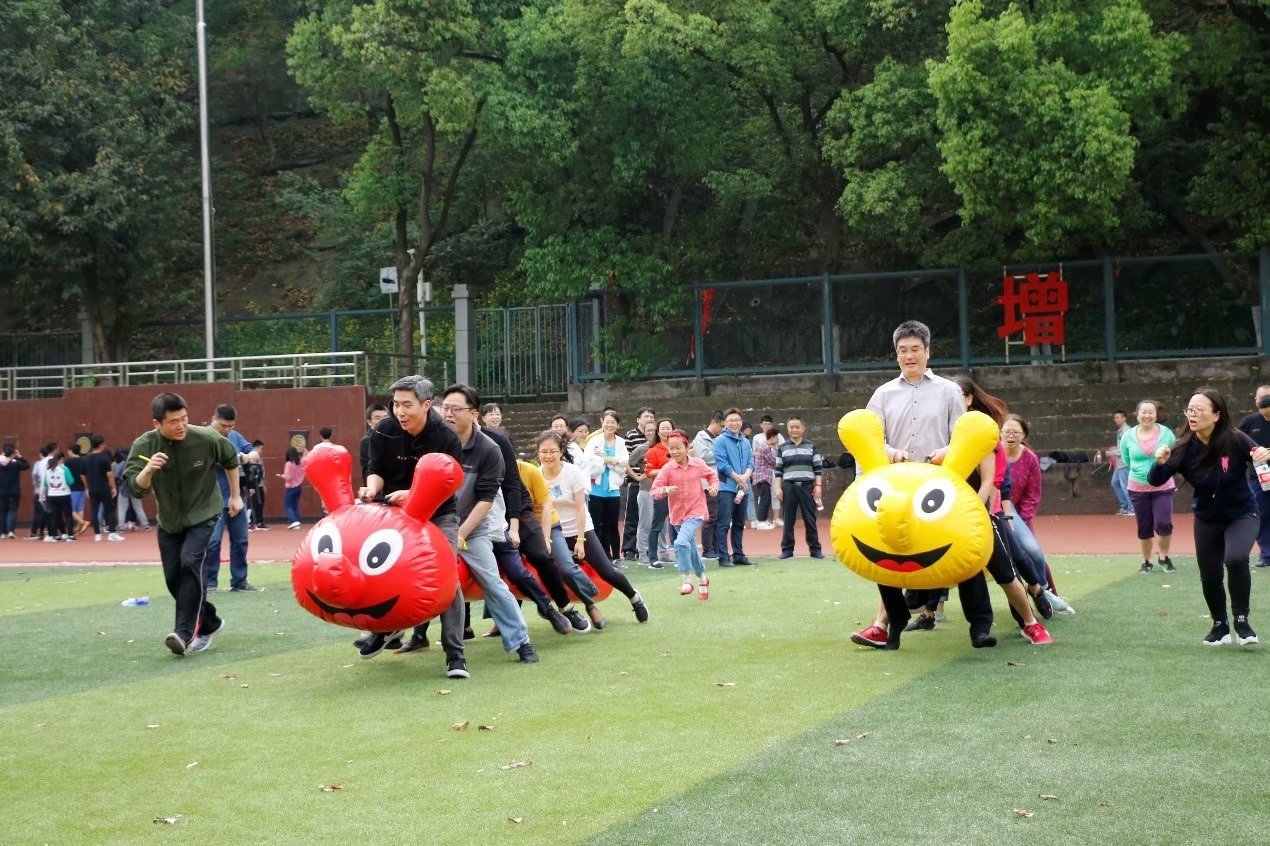 快乐第一,比赛第二,趣味运动会将快乐进行到底。一声声呐喊,一次次鼓掌,伴随着你们一步步向前奔跑,跳跃,投掷。于是,这里有了你们团结的、挥洒汗水的身影,更有你们可爱、有趣的合影。欢乐毛毛虫上,一张张笑脸洋溢着活力;搭桥过河游戏中,快乐被双手传递;地雷阵里,是脚步的寻寻觅觅;风火轮里,转动的是欢声笑语;投掷飞镖的你,将欢乐锁定……