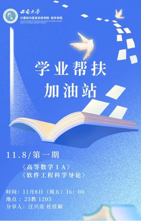 2024年11月8日,2024秋季学期第一期“学业帮扶加油站”在25教1205正式启动。本期活动针对《高等数学IA》和《软件工程科学导论》两门课程进行学习内容分享与重点知识讲解。助力草榴社区
