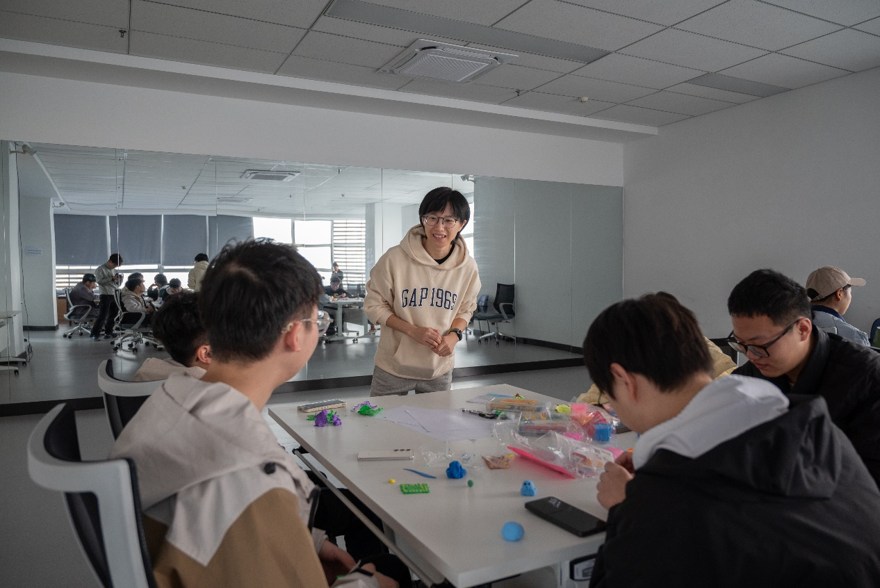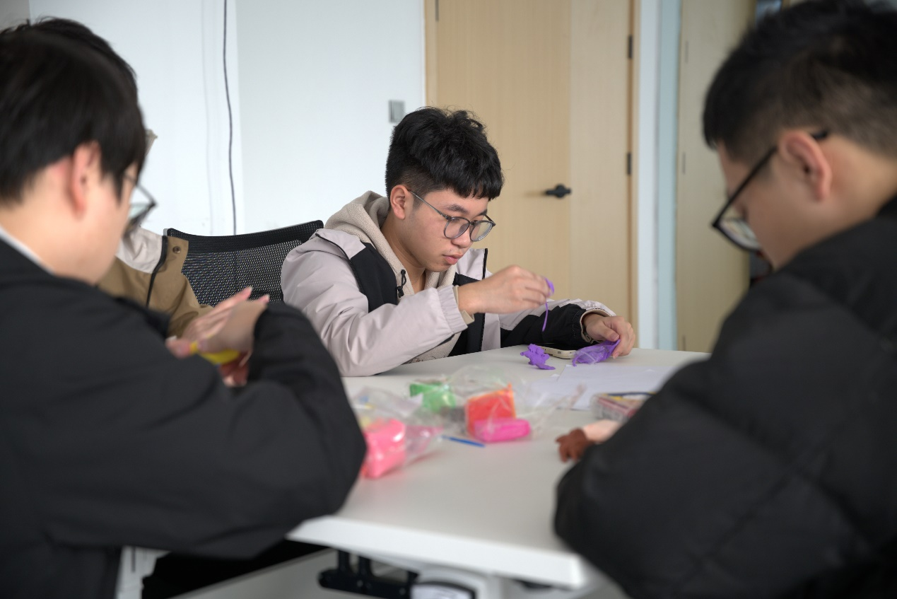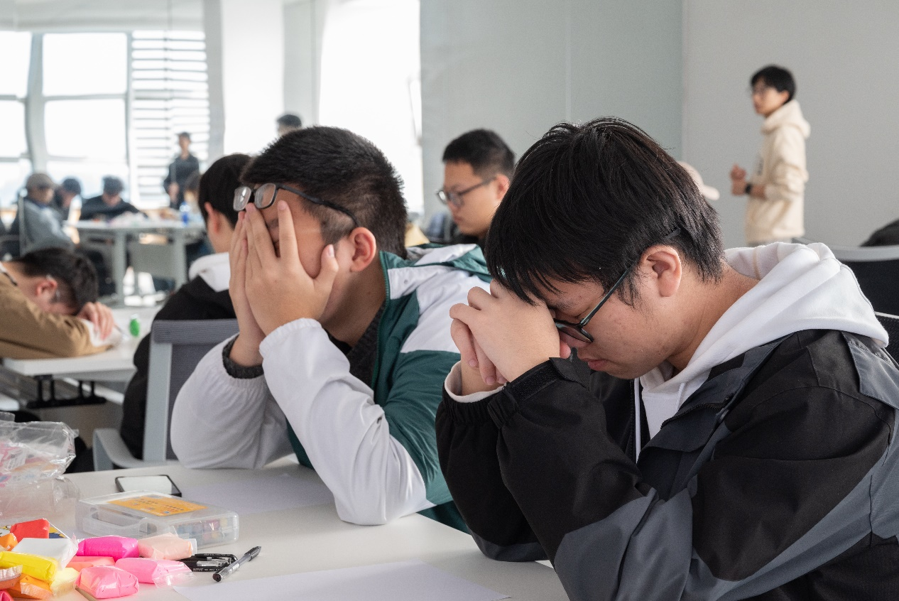 接着,冯夏老师以一种极具创意的方式引导学生们开启自我认知之旅。在老师轻柔话语的引导下,学生闭上眼睛,想象自己置身于宁静的湖旁,湖水如镜,倒映出自己的模样,让同学们在脑海中勾勒出自己的形象。随后,学生们拿起粘土和蜡笔水彩,将心中的自己通过绘画或泥塑的形式呈现出来。在冯夏老师徐徐的描述与引导下,同学们沉心与自己对话,精心探索着自己的每一个特点。