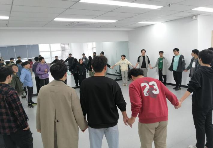 随着现场气氛的热络,冯夏老师采用别开生面的方法来要求大家做自我介绍,使用一种声音或者动作来依次自我介绍,大家的演绎吐露出内心的自我认知。接着,所有成员手牵手围成一个大圈,伴着轻柔的音乐,大家跟着带领者的动作,模仿着起舞,让身心在舞动中得到放松。模仿舞动结束以后,三人一组进行情景雕塑练习,一个人扮演当事人(主体),一个人扮演事件中的另一方,一个人做观察者。小组中的同学自行分工,选择一个带有情绪的生活片段进行演绎还原。