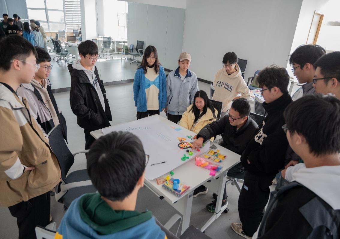 在小组合作环节。同学们齐聚在一张大纸旁,将各自对自我的认知融入到集体创作中,相互交流、相互启发,共同完成一幅作品。在这个过程中,同学们不仅进一步深化了对自己的认识,还学会了在团队中表达自我。活动中,同学们通过冯夏老师的引导,在轻松愉快的氛围中完成了对自我的深度探索,同时也在想象与自然的连接中感受到了自然的魅力。