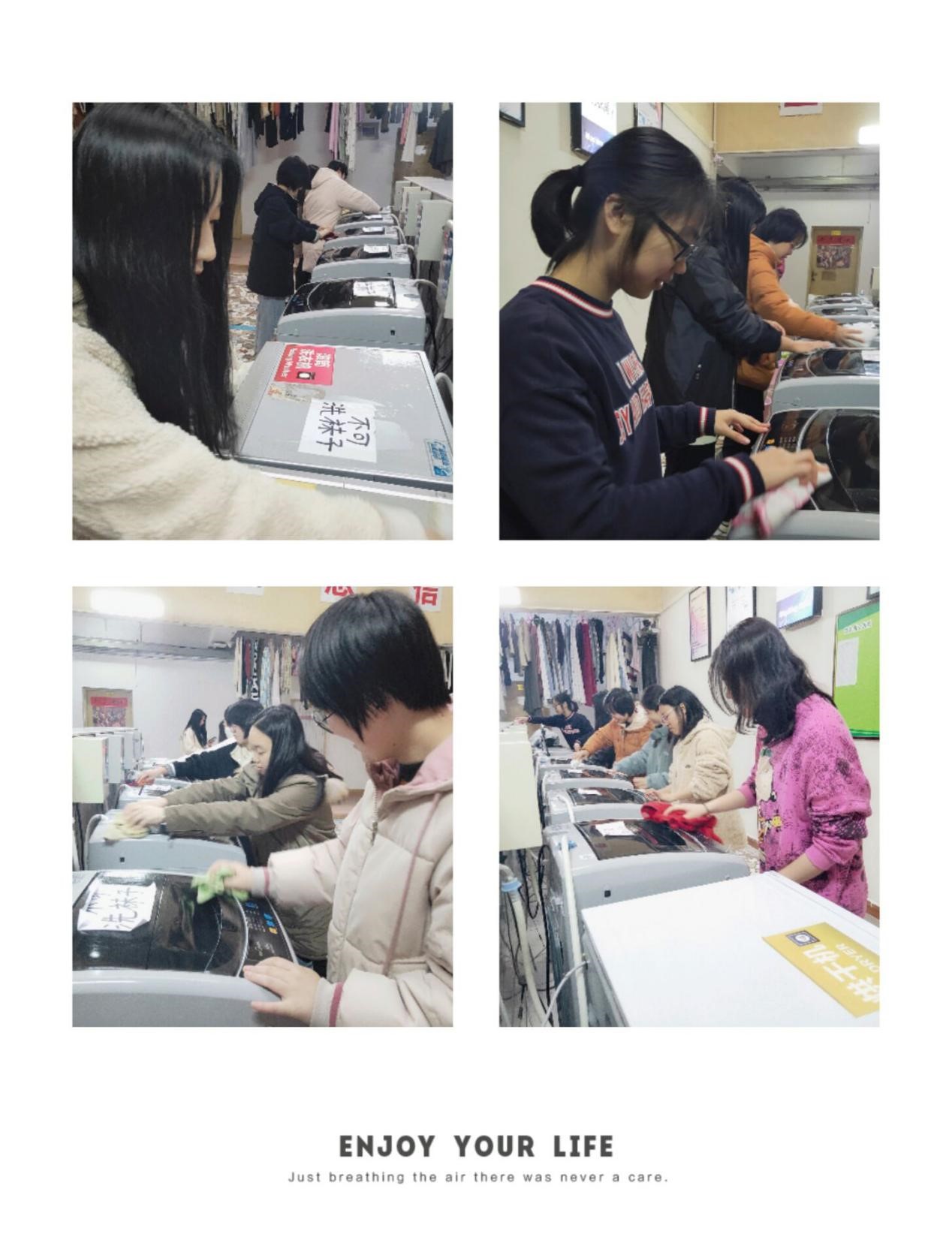 虽是大雪将至,天气严寒,大家却因为手头的活而忙出了一身汗。总有一群人,他们不惧寒冷,一双双手拿着湿毛巾认真的清洗着大家每天都会使用的洗衣机。洗衣机里里外外,都被擦得仔仔细细,就是有人做这平凡的小事件,才便捷了许多人的生活!他们忙碌的身影值得被每一个人看见。