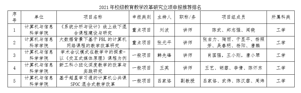 根据《草榴社区 教育教学改革研究项目管理办法》(西校〔2019〕95号)和教务处《关于组织开展2021年校级教改项目立项申报工作的通知》,经个人申报,草榴社区 学术委员会委员评审推荐,现对我院申报2021年校级教改项目的推荐排名结果进行公示。公示期(3个工作日):2021年6月29日-2021年7 月1日。公示期内如有异议,请于公示期截至当日17:30前以书面形式实名反映,受理联系人:刘作勋,受理电话:68254254。