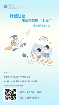 为培养同学们生涯规划意识,帮助同学们及早确定目标与落实行动,5月7日下午四点,草榴社区 在青李空间开展“计信U谈:朋辈与你聊上岸”主题分享活动。草榴社区 党委副书记王晖老师、团委书记杨靖欣老师、2017级校友刘泽夷同学、2020级自动化专业姜畅同学,2020级软件工程刘振坤同学以及30余名同学代表参加本次活动。活动初始,王...