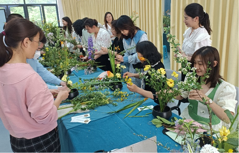 “智慧匠心”活动从花的美态中萃取灵感,从审美素养、花型塑造、颜色搭配等方面让教职工了解插花艺术,体验插花创作的乐趣。一把剪刀、一个水器、三两支花草,一个个错落有致、生机盎然、独具韵味的传统插花作品呈现在大家眼前。